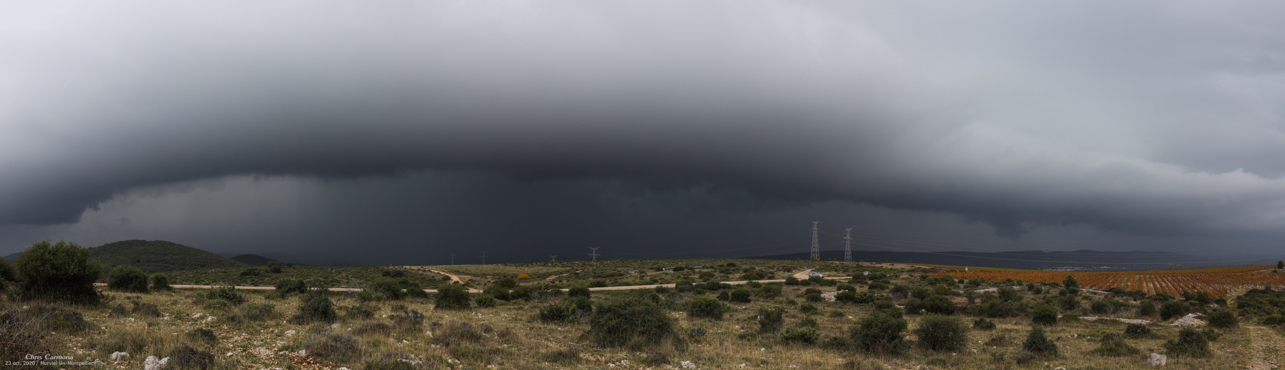 Et vais donc observer ça avec les collègues habituels sur l'est héraultais. C'est une vraie barrière de cumulonimbus qui s'offrent à nous du nord Gard jusqu'au Vaucluse et au-delà : (panoramique)