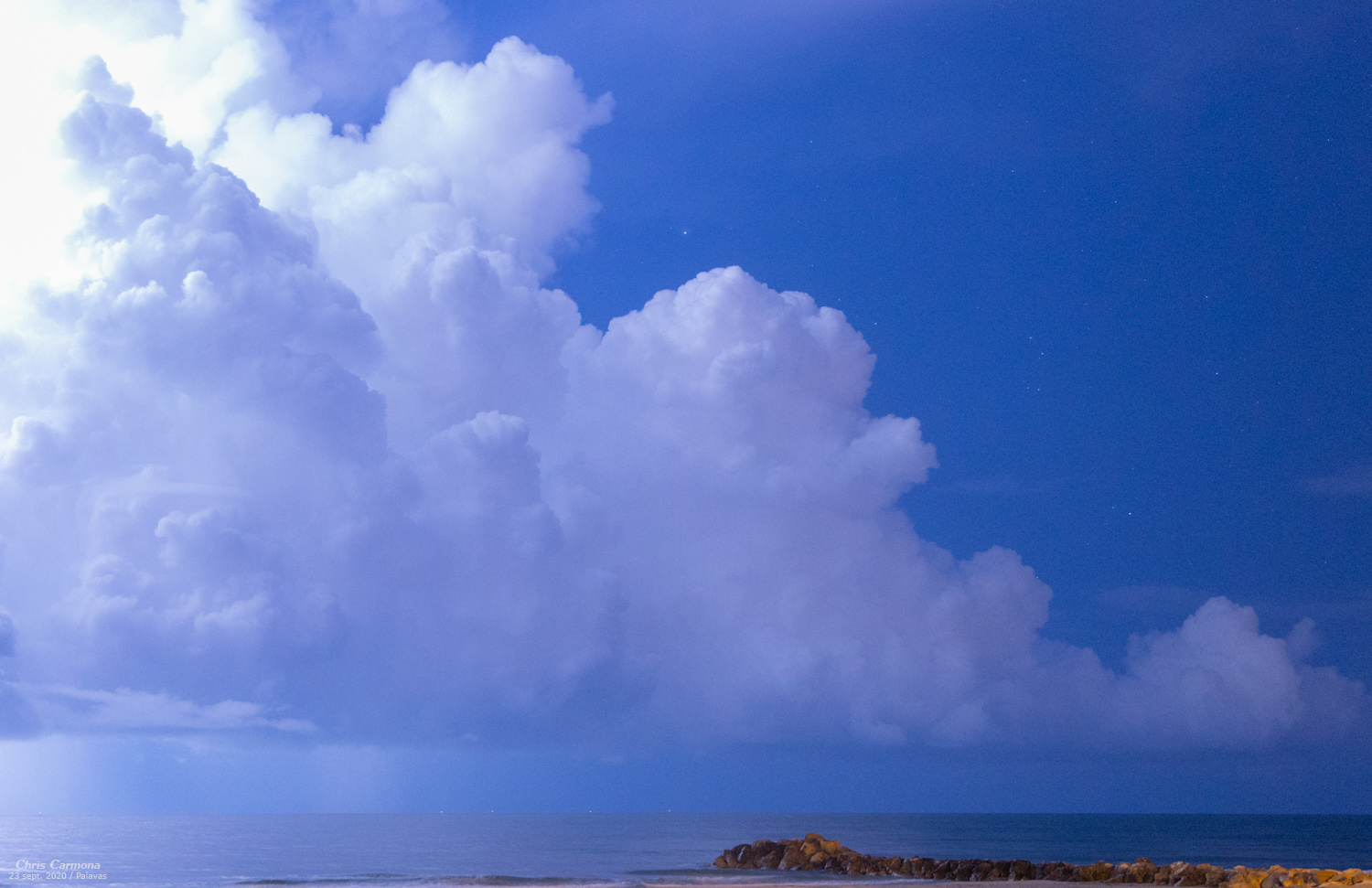 Quentin R. m'a rejoint, on va finalement se replacer sur le littoral héraultais pour la soirée à venir où la phase "méditerranéenne" de l'épisode devrait se dérouler. Avec Fabien également, le trio que nous formons constatons une fois encore la foire au flashs que forme les orages qui se sont maintenant mis en place dans les plaines intérieures. C'est du lourd mais il n'y a rien de visible... On se replace à nouveau pour avoir la vue sur l'arrière de ces orages qui au final vont épargner notre position. L'ambiance est toujours la mais pas de foudre. Vers la mer, le ciel se dégage un peu et dévoile une tour convective que je me mets à photographier avec l'un de mes appareils.