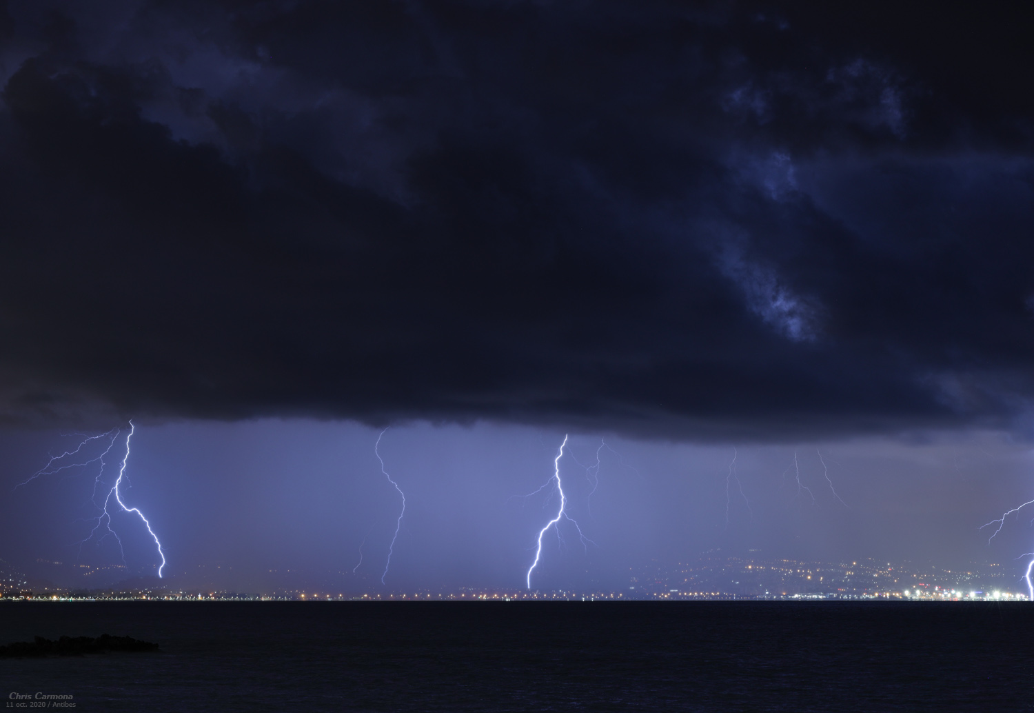 Et la foudre finit enfin par apparaître ! Un peu lointaine forcément mais pas tant que ça, et le cadre s'y prête bien avec les reliefs derrière. La zone aéroportuaire de Nice va se faire pilonner à plusieurs reprises. Le rythme de la foudre n'est pas dingue mais mis bout à bout, ça fait quand même une sacrée densité de foudroiement dans un espace restreint ! On observera ça jusqu'à ce que la pluie ne prenne trop le dessus sur notre position :