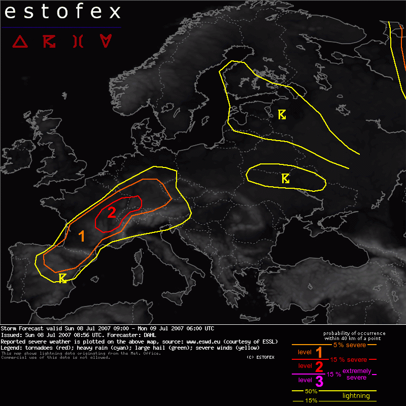 L'European Storm Forecast Experiment (ESTOFEX) précise aussi que l'envergure orageuse devraient fortement augmenter au fil de l'après-midi sur la France, avec la possibilités d'orages multicellulaires organisés et des risques qui leur sont associés (fortes rafales, fortes et soudaines précipitations, forte activité électrique,...) Une menace de tornades est également possible si le SFC ( Supercritical Fluid Chromatography) se renforce bas. Mais, l'indice de CAPE est plutôt faible et il peut rapidement disparaître après le coucher du soleil. Mais la montée d'un autre paramètre devrait entretenir et maintenir des orages en soirée et nuit...